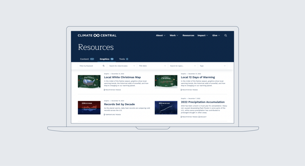 Climate Central’s work generates data, tools, and graphics to inform public opinion. However, the website had a lot of usability challenges: there were too many navigation options, it was complicated to find specific visuals, and there weren’t clear guardrails for how content was added or organized.